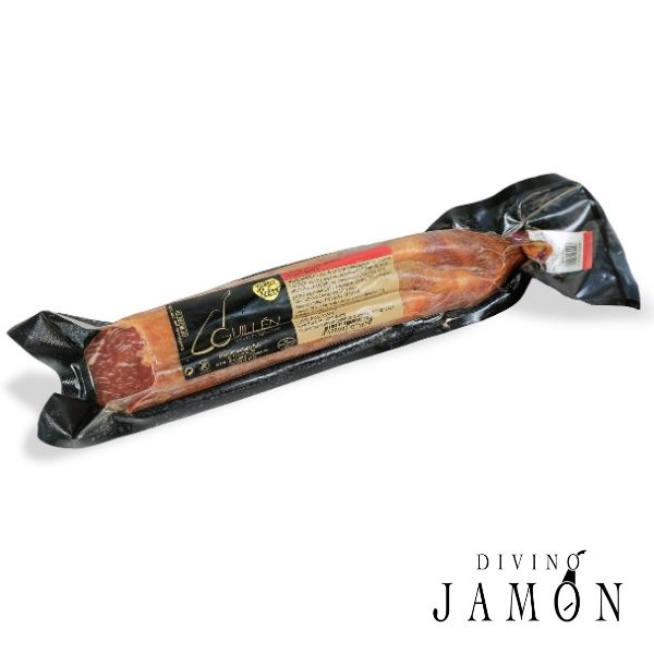 Lomo ibérico de bellota del 50% muy veteado, jugoso y un rojo vivo espectacular. Elaborada y curada de forma tradicional. Suave y jugosa. CONTIENE LACTOSA.