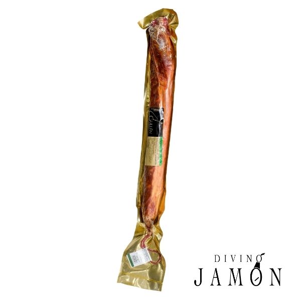 Una pieza para coleccionistas. Chorizo de Bellota Ibérico Gran Reserva embutido en Tripa Roscal (bovino). Este formato de gran calibre permite una curación lenta y profunda de la carne de cerdos con doble montanera, logrando una textura y un bouquet inigualables.